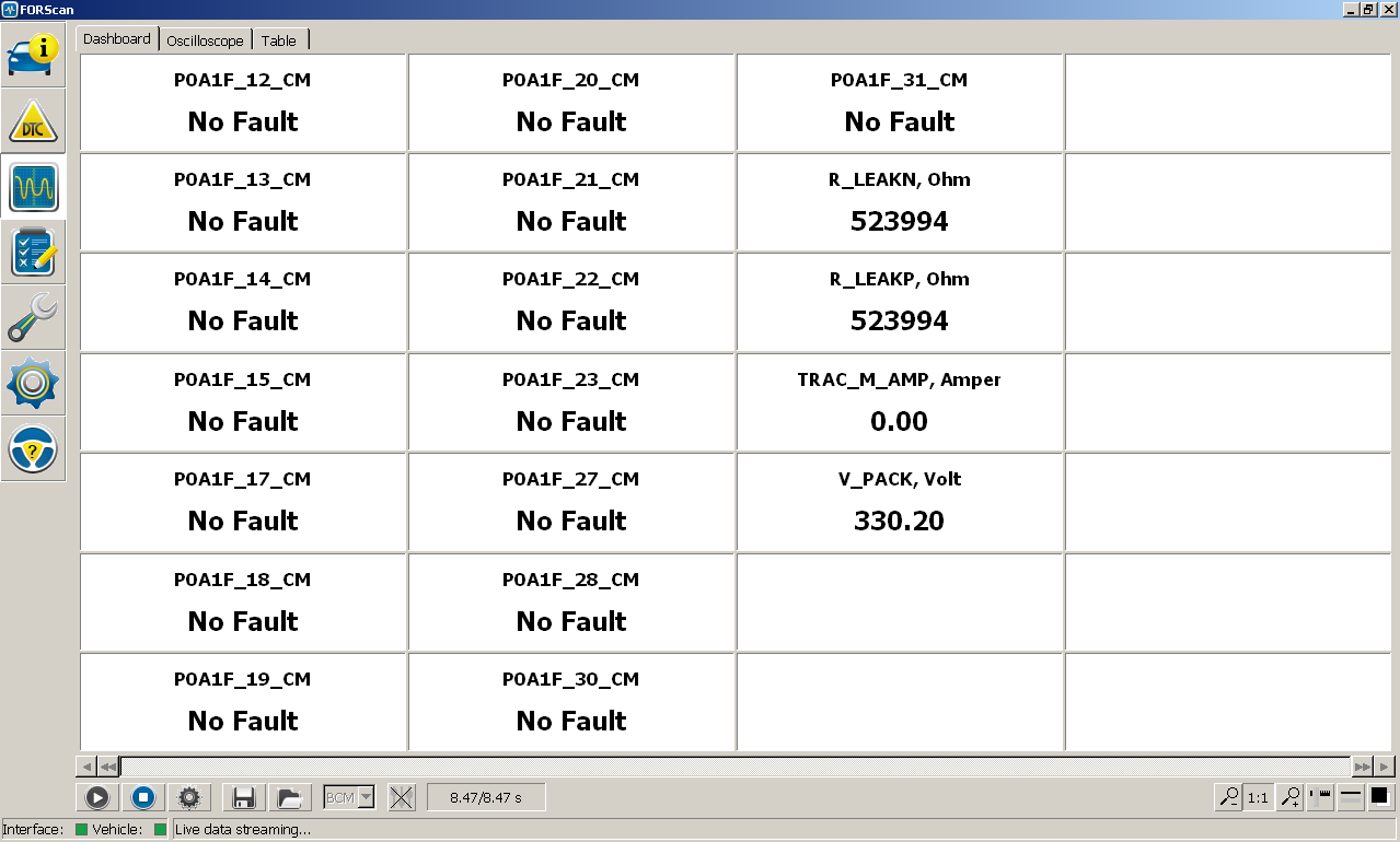 Sorry for keeping unnecessary parameters on the screen. I do not which one are important or not so. Regarding voltage difference. You mentioned that voltage is monitored in 25 places. So if we divide 330V by 25 - it gives 13.2V per battery. Having 0.38V difference on 13.2V is not that great but should not be so bad unless in that battery (10 cells) only one is the guilty one. I do not know what failure mechanism is - is it single battery fails or in the battery pack few or all batteries are generating lower voltages. I also can't find BCM RMODE_BALANCE function in my FORSCAN 2.2.8. I have only one test for BCM - and it only turns on FANs inside of the battery. Also I've noticed tha TRAC_M_AMP is negative when motor is not working and Key is only ON. But is fluctuating from -10A to +2A when engine is working. So I guess it's OK. All 250 cells are in series. If one fails, the battery is done. Other parameters of concern are the charge discharge limits. I don't remember the exact numbers, but the maximums are above 20,000. When these are below the maximums, the BCM is limiting charge/discharge in response to some control parameter. Most common are the battery temperature and SoC during normal operation. The fact that these are less than their maximum limit with no other obvious cause is a concern: https://cimg8.ibsrv.net/gimg/www.gre...4e53257376.jpg Given that the delta value never drops to the typical <0.2V range, all signs point to failing cell in the battery. IIRC, the R_MODE_BALANCE ( or similarly named) function is on the wrench tab. |