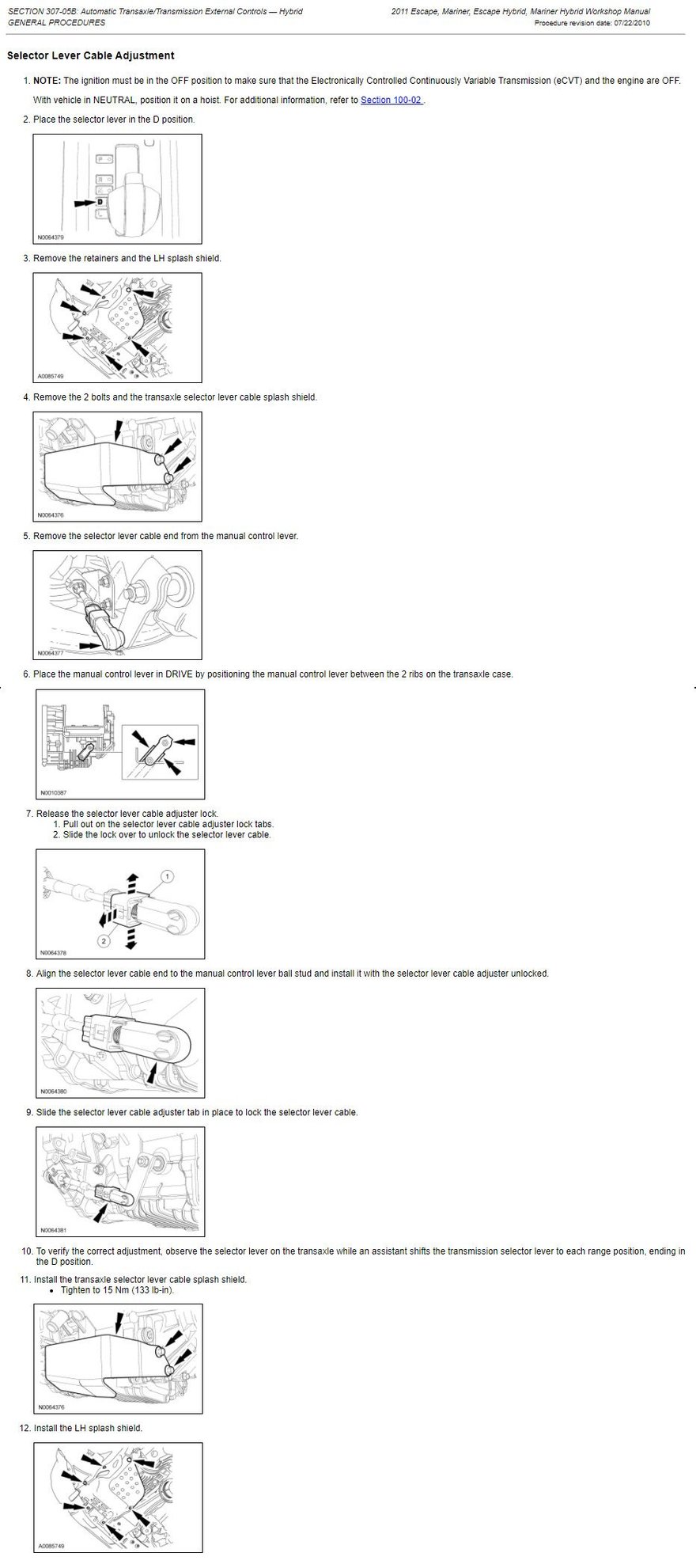 Shifter Cable Adjustment Procedure - 2011 Ford Escape Hybrid