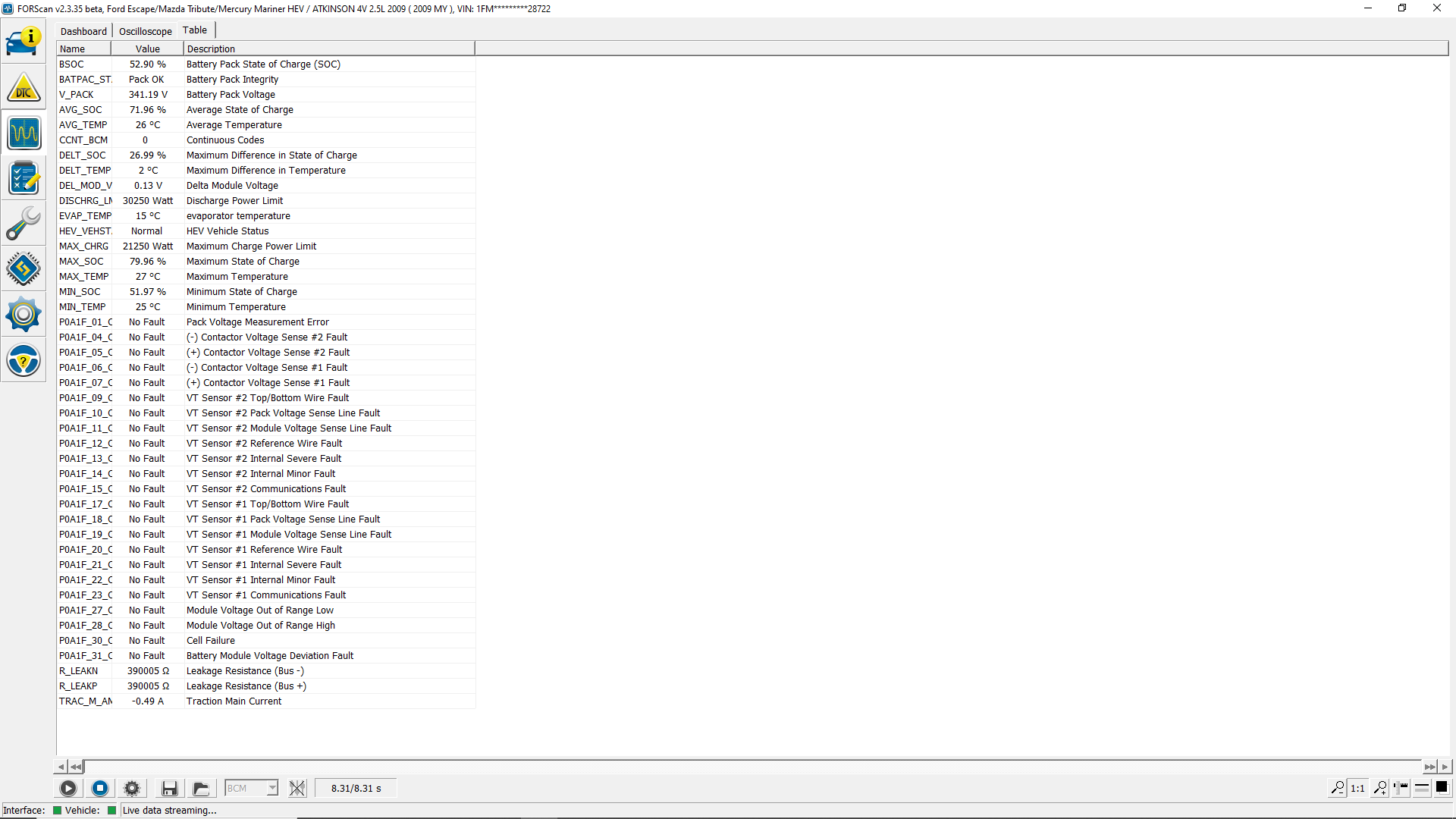 I have an intermittent code- P0A1F. At first I thought it was related to acceleration- but after many tests- it seems completely intermittent. Sometimes I get just the wrench light. Other times I get both the wrench and check engine light. I have reset the DTC's and Rmode re-balanced (30mins, 45 mins) twice. The only thing that this code dose every time is suspend the hybrid engine. The battery will not kick on while idling or while in low speed situations- after the warning lights come on. I have found that if I reset the DTC's then run a Rmode re-balance I can get the hybrid engine to work again - temporarily. As soon as the code pops, the hybrid engine won't assist. I can still turn the engine over though. The other odd thing is that the warning lights will not turn on every time. By that I mean, I can drive it for 20 miles. The warning lights will come on. I will then turn the engine off, leave and come back, turning the engine on. The warning lights are no longer there. But the hybrid battery functions are still suspended. I have posted the code list here, and the Forscan reading of the BCM after the code had popped.
