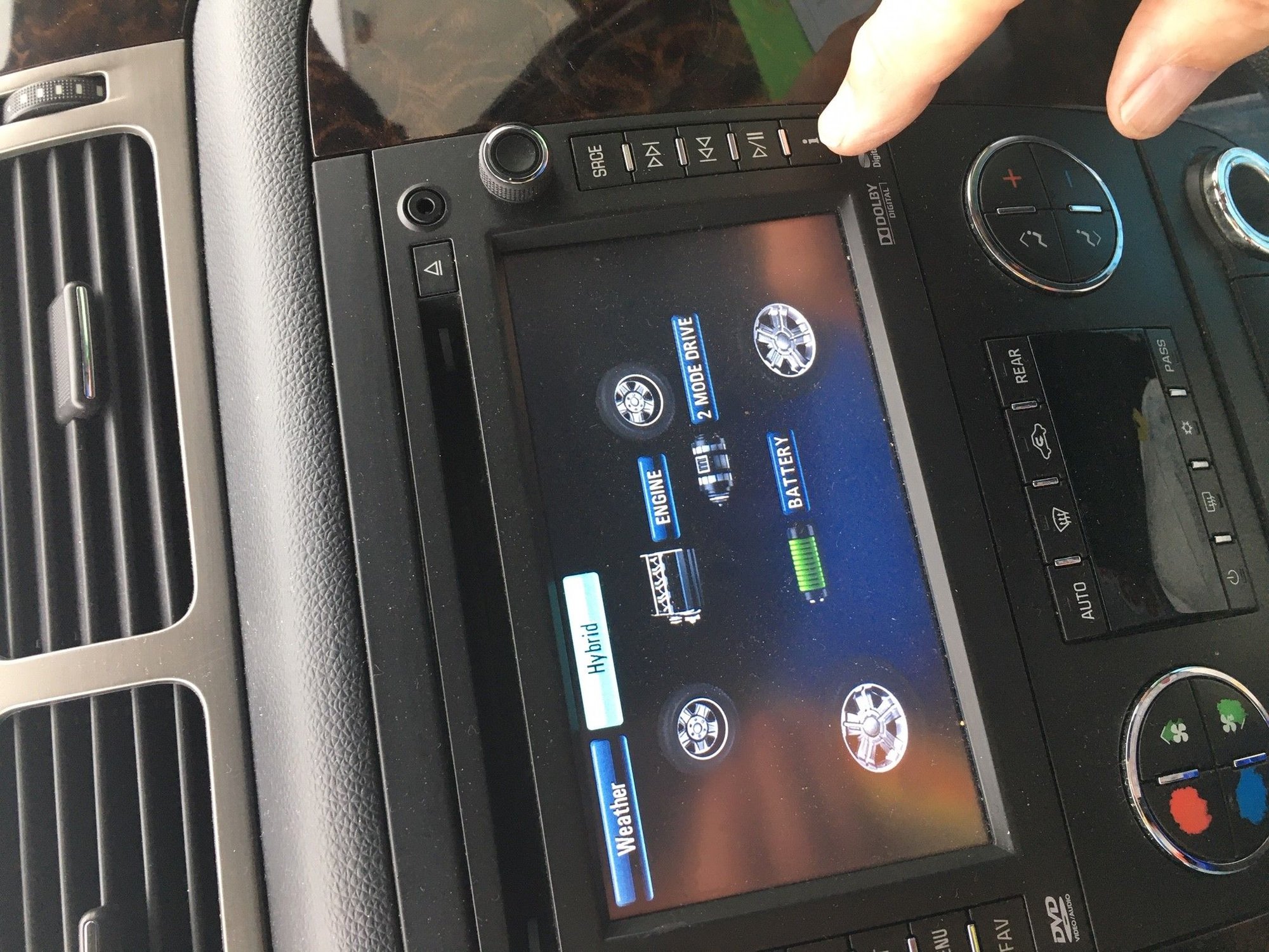 I have a 2013 Yukon hybrid Denali. I concur the Info button gets you the screen with the weather or hybrid buttons. When I press hybrid button I get the animated wheels, engine, battery screen and shows you in animation what is happening in the hybrid mode.