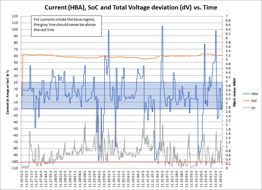 In the Current, SoC and dV chart, you can see that for currents inside of ±20A, the gray line representing the maximum block voltage deviation routinely exceeds the red line (0.3V). This is bad.