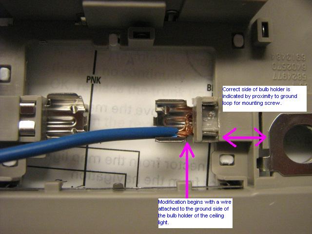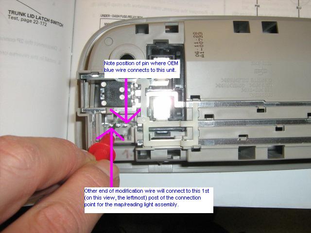 6.a. Ensure that modification wire passes into map/reading light assembly cavity in same way that OEM Blue wire does so;