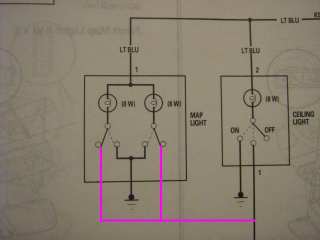 As detailed in the last picture, I'm going to tap the map lights "off position" into the ceiling light "pink" ground wire....
