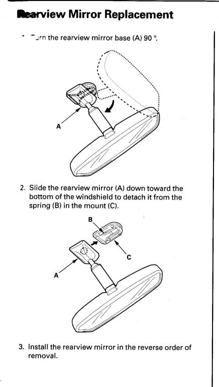 page 3 of these instructions show how to turn the mirror to get it off you will need to remove the black wire cover from the roof to the mirror first - it pushes up from the window mount.