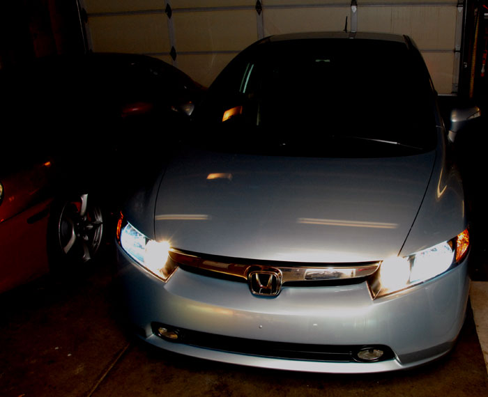 Here is a picture of the car with the front bumper off (for the other modifications), and you can see the new bulbs.