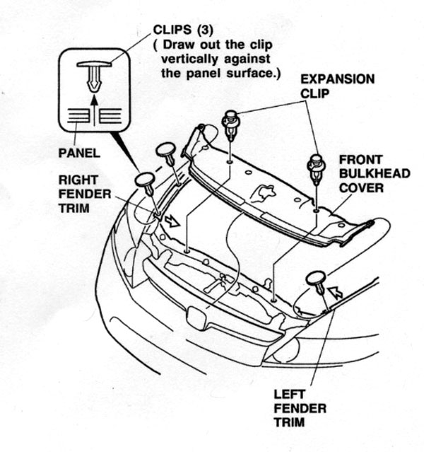 I found that a nail puller handle works great to pop out the expansion clips. If you don't have one of those, a small flat bladed screwdriver will work just fine. On both sides of the cover there are clips molded into the bumper cover that hold the cover to the front fenders. You have to give them a tug on the cover to get them to pop loose.