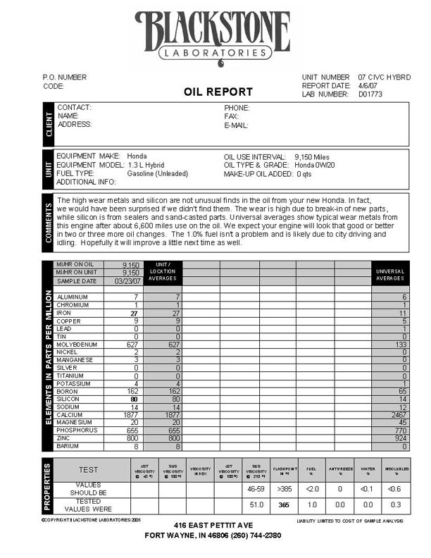 To give you an example of the condition of the oil in your car, here is the oil analysis I had performed on my cars initial fill when it was drained at 9200 miles.