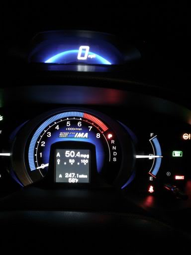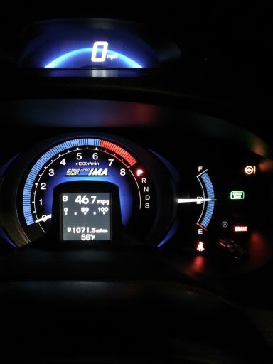 1st tank - Right off the lot, tank almost full I got 400 miles on the nose before I refilled. 2nd tank - A little better about 425 miles on 9.5 gal. 3rd tank is looking better yet - Almost 250 miles so far. The trip meter is at 247 and the gas gauge is almost exactly halfway. Looks like I'm on track for a 500 mile tank. Attachment 3205<br> Attachment 3206 500/9.5 = 52.6. If anything it looks likes the estimated MPG are a little low. My '03 HCH was always a little high. It looks like Honda erred on the side of caution this time. |