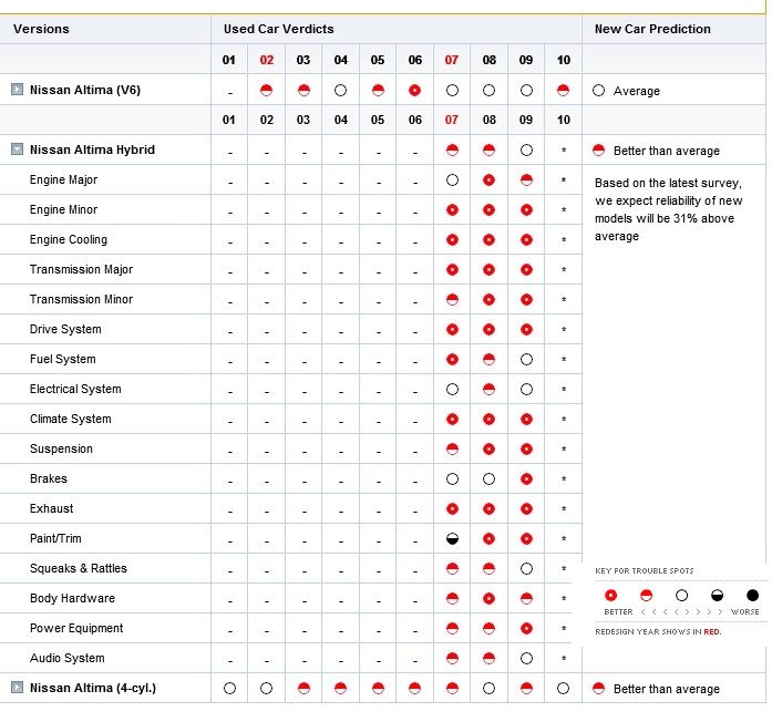 I've attached Consumer Reports reliability data. The * means they have insufficient data. http://www.consumerreports.org/cro/c...faq_ov.htm#2.1 mentions they "require a minimum of around 100 cars to publish reliability information for a model in a given model year".