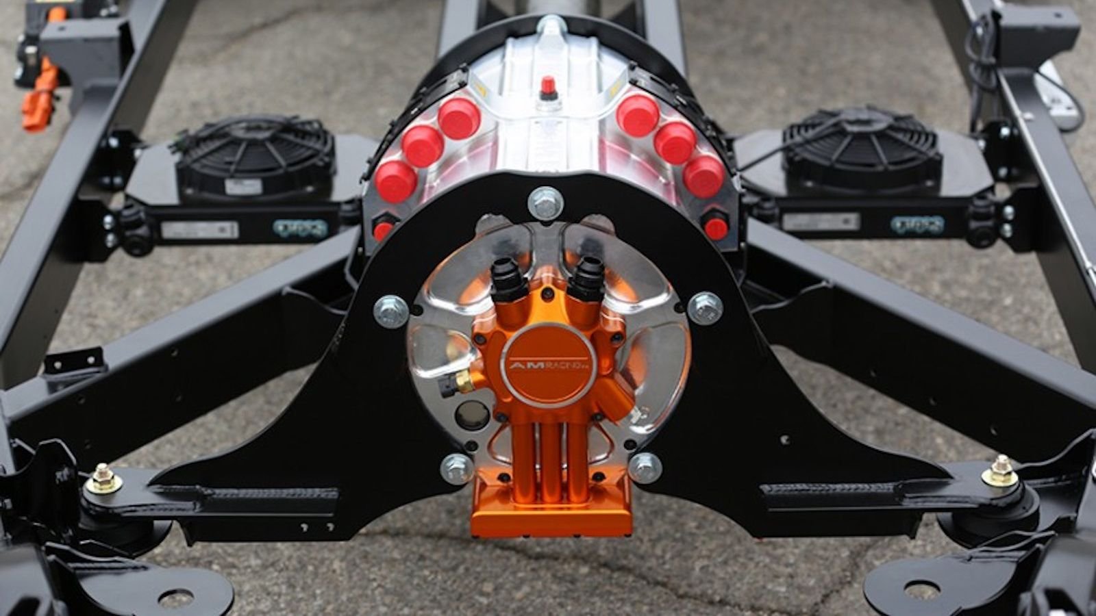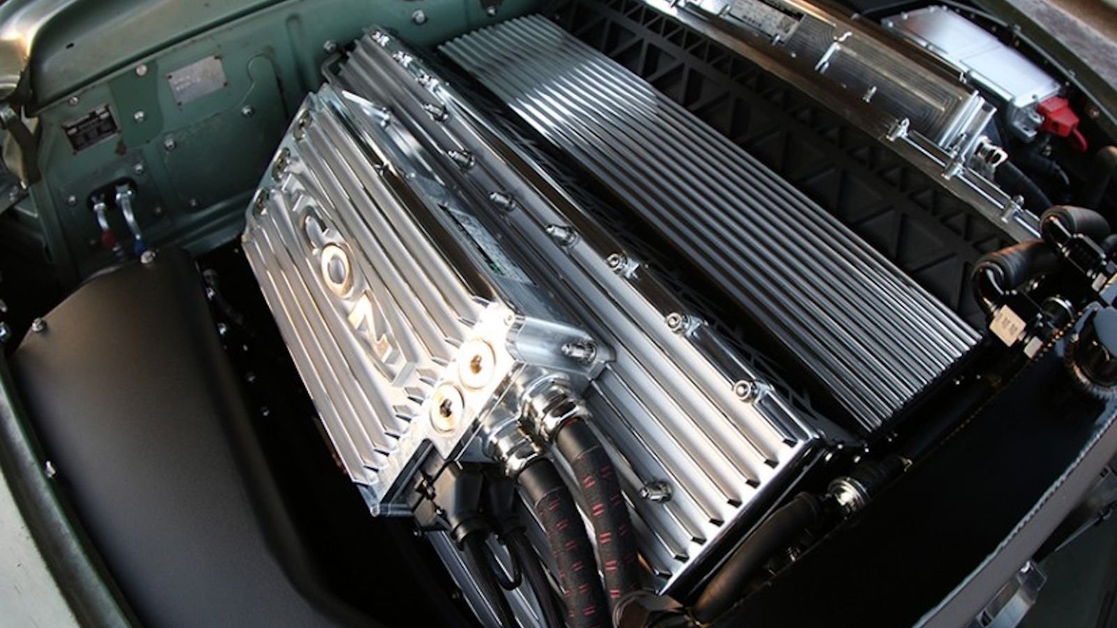 Under the hood lies a specially-crafted CNC'ed aluminum "engine" housing that pays homage to the past. Inside you'll find several Tesla batteries and controller system components. Further additions include a modern high-voltage wiring harness wrapped in traditional black and red cloth branding.
