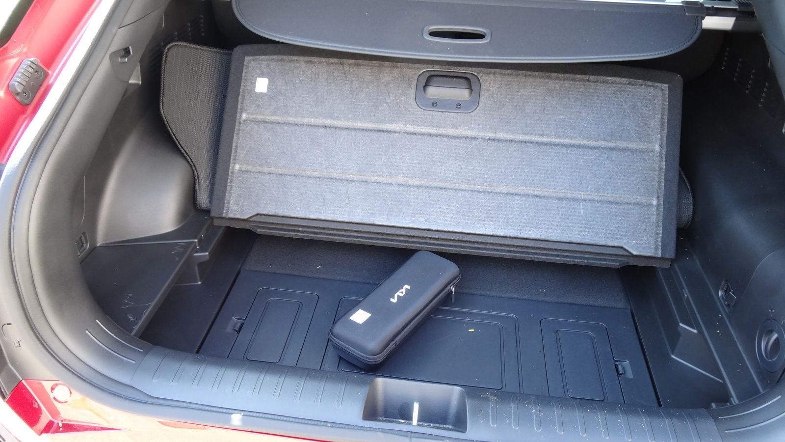 Behind the second-row seats, there are 28 cubic feet of storage. There is no room for a spare tire under the floor though, only a charging cable and minor items.